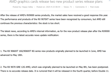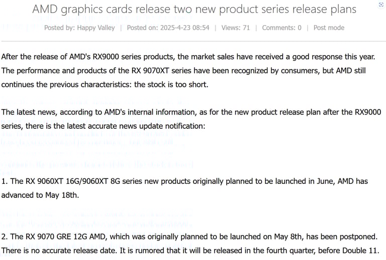 En effet : Board Channels, un forum suivi de près par les partenaires constructeurs, a publié une mise à jour concernant la Radeon RX 9060 XT. Cette carte graphique milieu de gamme, basée sur le GPU Navi 44, est annoncée depuis plusieurs semaines pour une sortie imminente. Initialement, AMD prévoyait de dévoiler ce modèle en mai durant le Computex, avec une disponibilité en juin, comme nous vous le disions dans un précédent article.