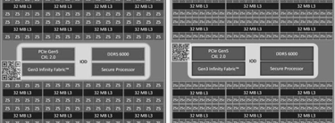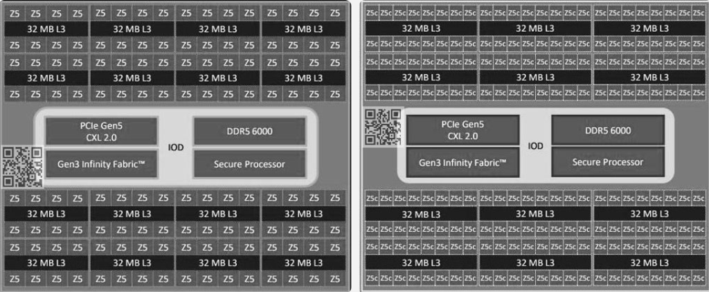 Accompagnant ces photos, YuuKi a partagé deux schémas confirmant la disposition des futurs processeurs. Le design EPYC classique devrait comporter une puce IOD et 16 CCD, tandis que la variante dense opte pour 12 CCD. Chaque puce de calcul abritera son cache L3 de 32 Mo, aboutissant à un cache L3 cumulatif maximal de 512 Mo.