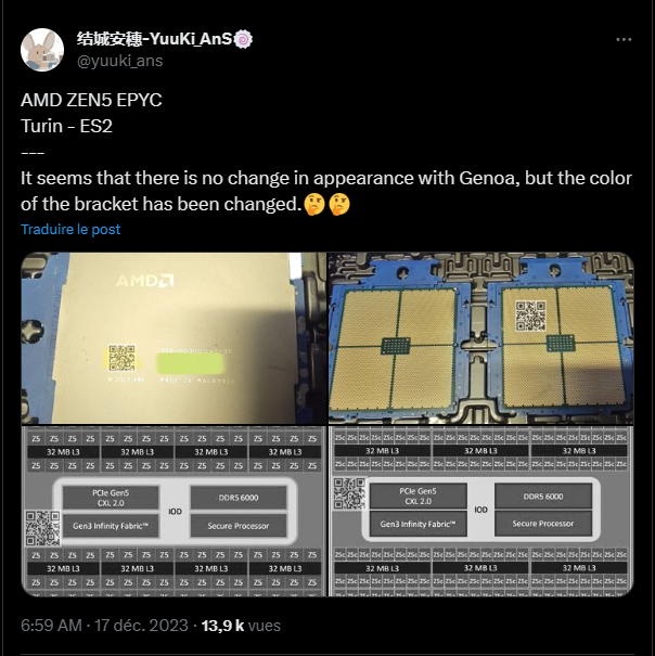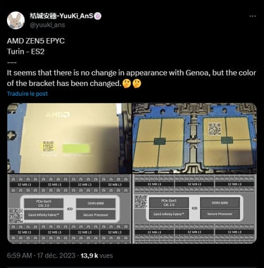 Des fuites de l'informateur YuuKi_Ans dévoilent, en photos et images, les processeurs EPYC Turin.