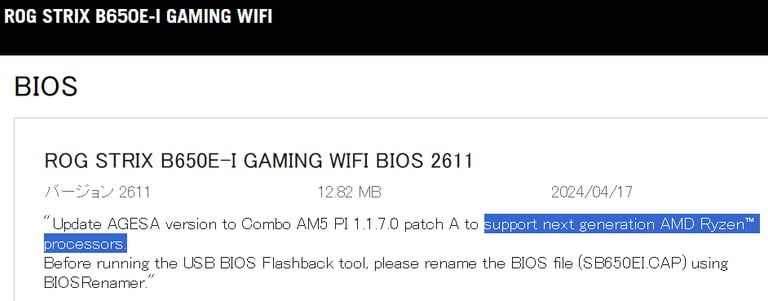 Bien que le nom officiel de la série basée sur Zen5 n'ait pas encore été annoncé, les indications de AMD suggèrent qu'elle sera appelée Ryzen 9000. Ces séries devraient être compatibles avec toutes les cartes mères basées sur AM5, avec seulement une mise à jour du BIOS nécessaire. Certaines cartes ont déjà cette mise à jour disponible, même si AMD n'a pas encore lancé ses CPU Zen5 de bureau. La première carte ASUS, la B650E-l Gaming ROG STRIX, prend donc désormais officiellement en charge les CPU Ryzen de prochaine génération.