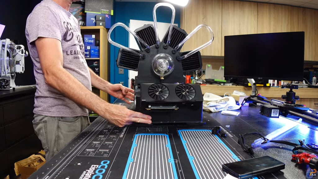 Mais au fine résultat final ne ressemble à rien de classique ! Une structure ouverte, une “boule” réservoir Alphacool en évidence, quatre radiateurs massifs alignés comme des éléments mécaniques, la carte graphique exposée, des lignes tendues et une identité très marquée. Ce n’est pas un PC de bureau traditionnel. C’est une pièce d’exposition conçue pour un événement, un objet qui assume son côté expérimental !