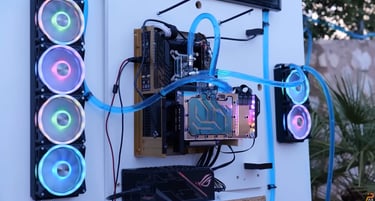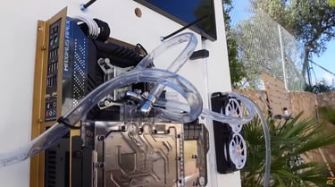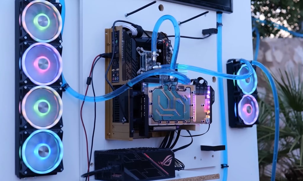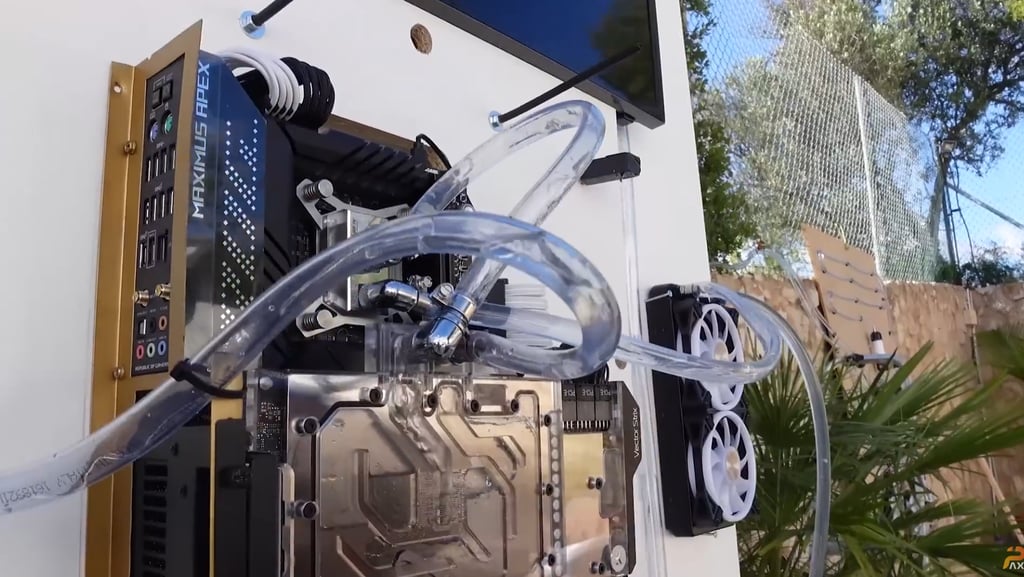 Pour tenir le défi, l’équipe met en place un PC mural organisé autour de plusieurs panneaux, avec la config au centre et tout le reste réparti autour : réservoirs, radiateurs, tubes en spirale, longues sections de tuyauterie. On parle aussi d’une pompe très costaud, parce qu’à 100 mètres, tu n’as pas le droit au “petit setup tranquille” : si ça ne pousse pas, ça ne circule pas !