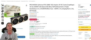 La plus marquante du lot, c’est la RTX 5080 MSI Inspire, affichée à –20% : une vraie carte 4K pensée pour le gaming, située juste sous la 5090, mais à un prix nettement plus cohérent. 16 Go de VRAM, excellent refroidissement, et surtout un tarif qui la rend beaucoup plus accessible que d’habitude dans le haut de gamme.
