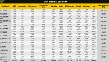Une nouvelle analyse du site TechSpot montre que le marché des GPU s’est nettement tendu entre novembre 2025 et février 2026. En comparant les prix les plus bas en stock de 14 cartes graphiques actuelles dans 10 régions du monde, le constat est clair : tout augmente !