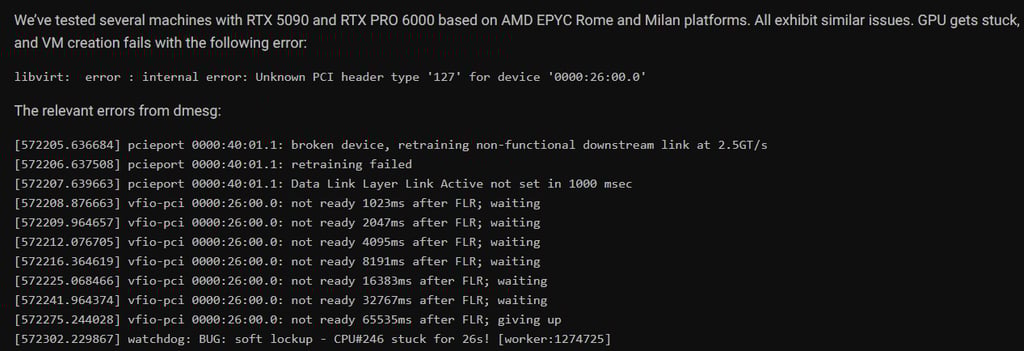 Le souci a été repéré par CloudRift, un fournisseur de GPU cloud, mais aussi par des utilisateurs Proxmox. Concrètement, après un reset de la carte graphique en environnement virtuel, le GPU cesse de répondre, ce qui entraîne un blocage de l’hôte et des machines invitées.