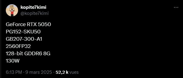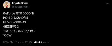 Tout comme il l'a fait pour la RTX 5060 et qui a fait l'objet d'un article hier (lire l'article ici : ), le leaker @kopite7kimi a révélé les informations sur les RTX 5060 Ti et RTX 5050, confirmant leur existence et dévoilant leurs caractéristiques techniques. On fait le point ensemble.