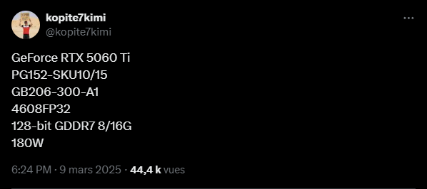 Leaker bien connu, @kopite7kimi a dévoilé de nouvelles informations sur les RTX 5060 Ti et 5050, confirmant plusieurs rumeurs récentes.
