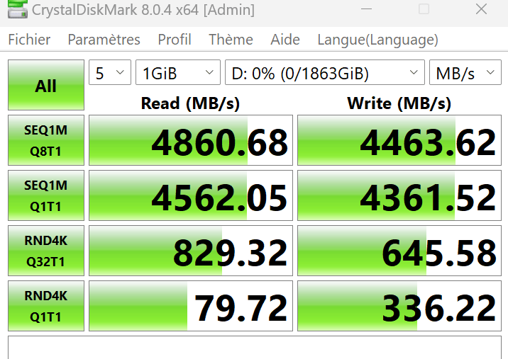 Nous pouvons constater sur ces deux tests que la différence en lecture-écriture entre des tailles de block de 8 KB et 250 KB, cette perte de vitesse est due à la chauffe et donc au throttling qui en découle, ces résultats sont cohérents par rapport à la moyenne des NVME du marché.