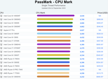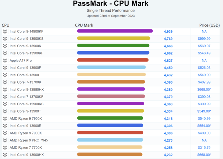 En ce qui concerne les performances multi-cores, le i9-14900KF n'est pas loin derrière, affichant des performances presque identiques au i9-13900K, avec seulement une différence de 0,6 %. En revanche, il se fait quand même distancer par le i9-13900KS. Si les processeurs Intel Core i9 dominent le haut du classement pour les performances mono-core dans le classement PassMark, les processeurs AMD Ryzen 9 prennent la tête dès qu'on parle de perfs multi-cores.
