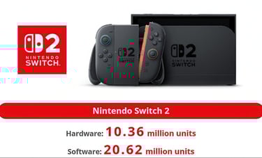Les ventes de jeux suivent le mouvement : 20,6 millions de titres ont été vendus, avec en tête Mario Kart World (9,57 M) et Donkey Kong Bonanza (3,49 M).
