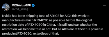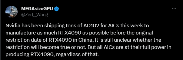 Selon les dernières informations, plusieurs marques de cartes d'extension AIC (Add-In Card) NVIDIA ont confirmé que la série RTX 4090 sera totalement interdite à la vente dans le pays après le 17 novembre. Il est conseillé à tout le monde de les acheter et de les conserver tant qu'ils sont encore disponibles. [...] On rapporte que, pour vendre plus d'unités avant l'interdiction, diverses marques de cartes graphiques augmentent leurs expéditions de la série RTX 4090.