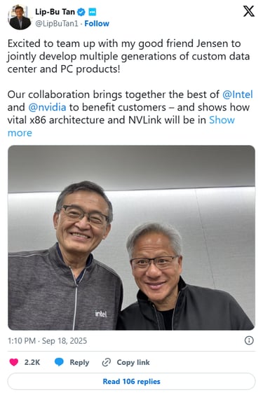 Hier, NVIDIA et Intel ont annoncé une collaboration d’une ampleur inédite, couvrant plusieurs générations de produits pour l’IA !