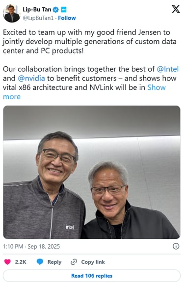 Lip-Bu Tan, PDG d’Intel, a souligné la complémentarité des deux entreprises, mettant en avant les fondations x86 et les capacités d’emballage d’Intel, ainsi que le leadership de NVIDIA dans le calcul accéléré :