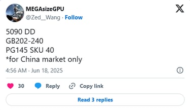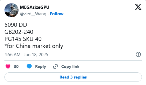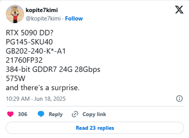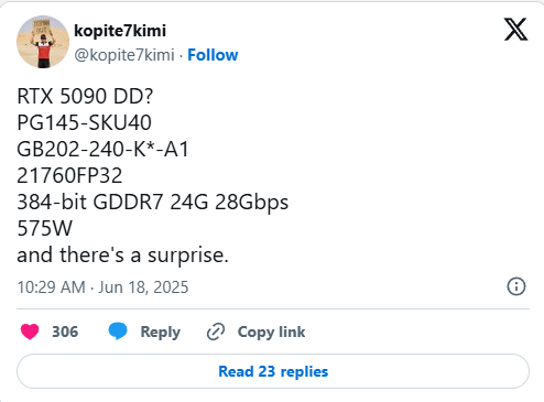 Selon les leaker MEGAsizeGPU et kopite7kimi, la 5090DD embarquera un GPU GB202-240, ce qui ajouterait une troisième variante à cette puce après les modèles 5090 (GB202-300) et 5090D (GB202-250).