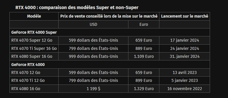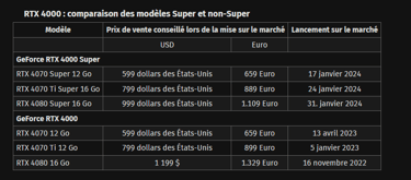 Avec l'arrivée des modèles Super, les RTX 4070 Ti et RTX 4080 seront progressivement retirées du marché. La RTX 4070 restera au catalogue, mais son prix passera de 599 à 549 dollars US.