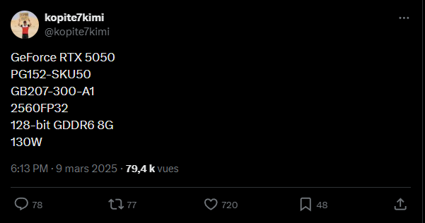 Une nouvelle variante de la GeForce RTX 5050 aurait été repérée dans des fuites récentes. En effet, selon le leaker kopite7kimi, NVIDIA préparerait un modèle équipé de 9 Go de mémoire GDDR7.