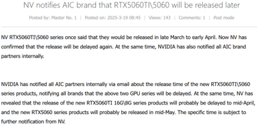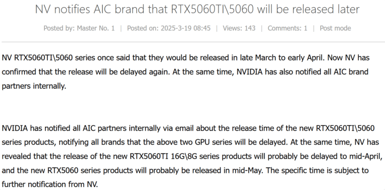 D’après Board Channels, un forum regroupant des membres de l’industrie des cartes graphiques, les nouvelles cartes graphiques de milieu de gamme arriveraient finalement mi-avril pour la RTX 5060 Ti et mi-mai pour la RTX 5060.