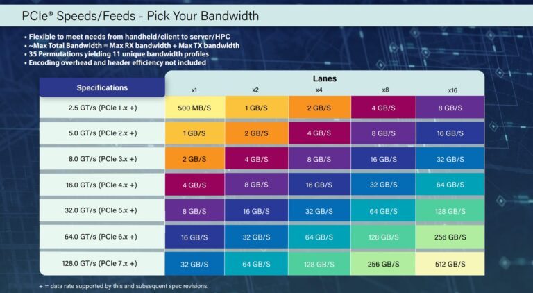 Le PCIe 7.0 s’appuie sur la signalisation PAM4, déjà utilisée avec le PCIe 6.0, et promet aussi meilleure efficacité énergétique, une faible latence, une fiabilité accrue, tout en restant rétrocompatible avec les versions précédentes.