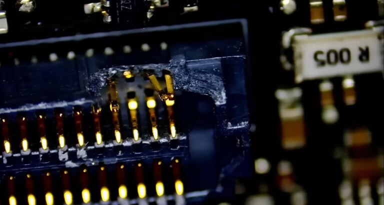 Le problème vient du design interne particulier de la carte : l’interface PCIe est reliée à la carte principale par un petit connecteur haute densité, semblable à ceux qu’on trouve dans les téléphones. Une broche tordue ou cassée, et c’est terminé : la carte ne peut plus être réparée !