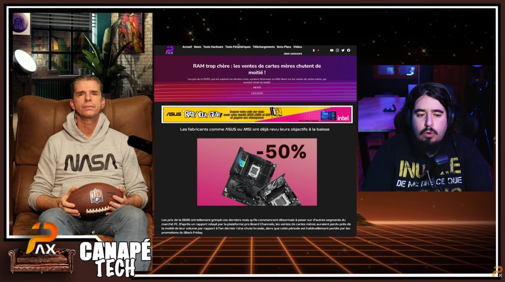 Ce Canapé Tech, c’est à la fois une alerte sur l’état du marché et un clin d’œil à notre petite communauté ! PAX et Jig prennent un moment pour parler de nous et vous remercier, vous les lecteurs fidèles de paxpc.fr et souligner l’importance de garder le lien, même quand le hardware traverse la tempête ! Merci à vous d’être là !