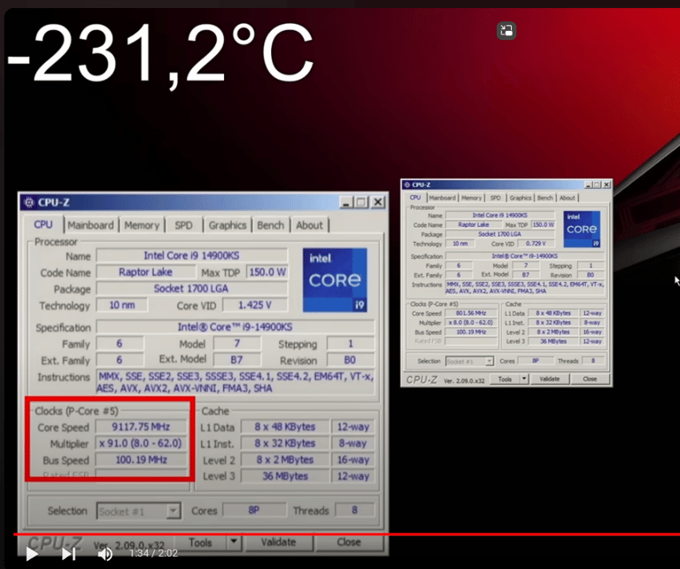 Le record a été atteint le 7 mars au siège d'Asus à Taïwan et a été rendue publique le 14 mars, en même temps que le lancement de cette nouvelle édition spéciale. Avec 9 117,75 MHz, l'équipe de Elmor a surpassé de 74 MHz son propre précédent record établi avec un Core i9-14900KF. À cette fréquence, il a été possible de charger Windows et de valider les résultats avec CPU-Z avant que l'ordinateur ne plante.