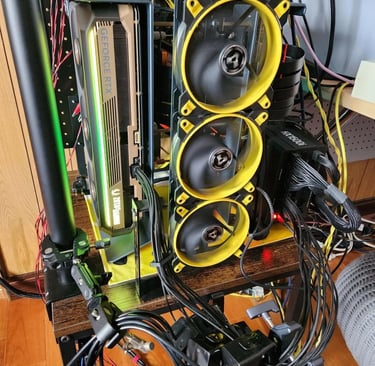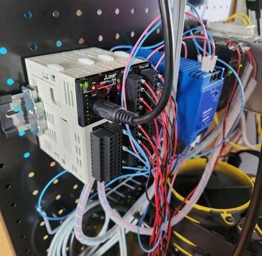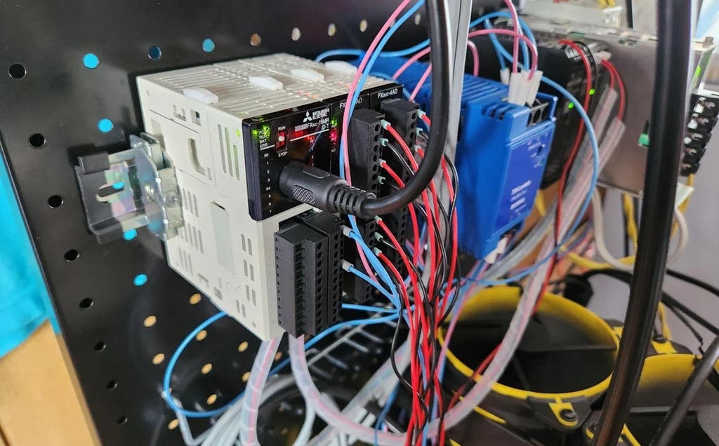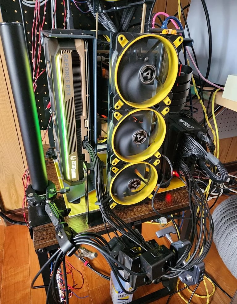 Ici, pas de schémas détaillés ni tutoriel : seulement quelques photos et une liste de composants. On y trouve une Zotac RTX 5090 AMP Extreme Infinity reliée à une alimentation Corsair HX1500i, mais aussi des éléments beaucoup plus inattendus : un automate Mitsubishi, des capteurs de courant et un relais de puissance, tous logés dans un joyeux fouillis de fils.