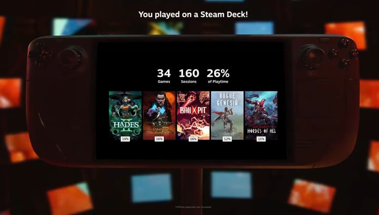 Steam Replay 2025 propose aussi des données sur le type de périphérique utilisé (clavier/souris ou manette), ainsi qu’un tableau spécifique pour les joueurs sur Steam Deck, leur permettant de revoir les jeux les plus joués sur la console portable.