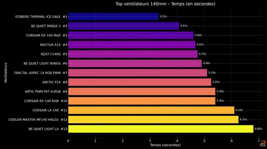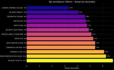 Le Iceberg 140 mm reste intouchable en débit pur, mais son bruit reste un facteur à considérer. Il est idéal pour les configs très exigeantes ou les gros AIO.