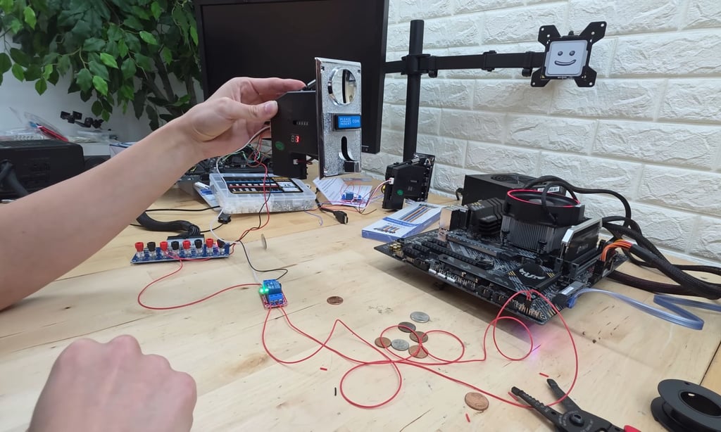 Dans sa vidéo, il présente un système inspiré des anciennes bornes d’arcade. À la place du traditionnel bouton Power, c’est un véritable accepteur de pièces industrielles qui fait office d’interrupteur.