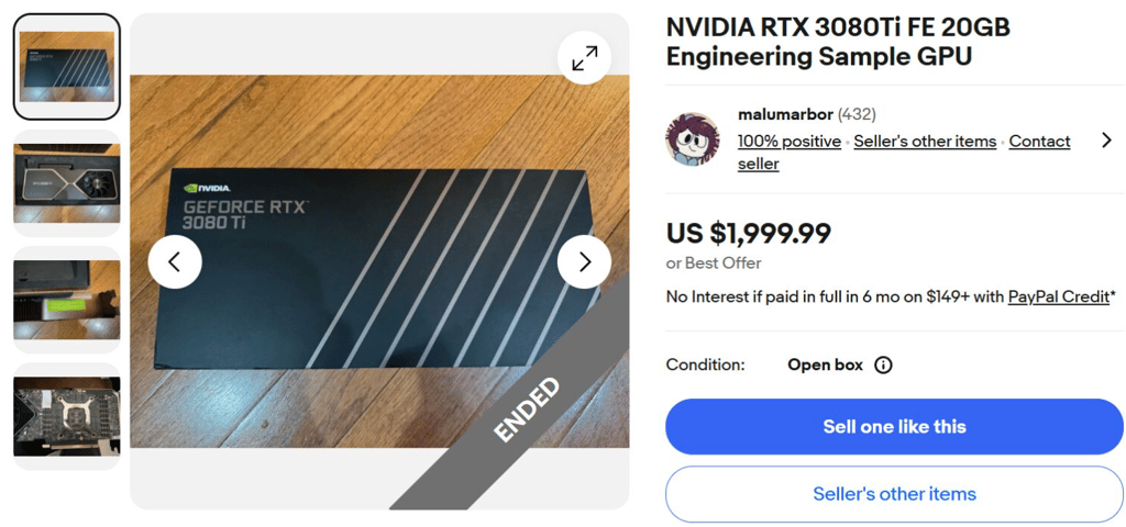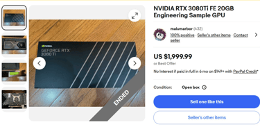 Une rare RTX 3080 Ti 20 Go prototype vendue 2 000 $ sur eBay