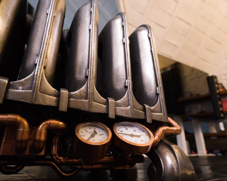 La configuration repose sur un Ryzen 7 9800X3D, une GeForce RTX 5080 et 32 Go de mémoire. Le radiateur alimente une boucle de watercooling contenant 18 litres de liquide. Les concepteurs précisent avoir utilisé un inhibiteur de corrosion, un point important lorsqu’on intègre de la fonte dans un circuit liquide fermé.