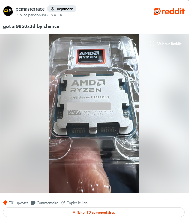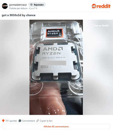 Le Ryzen 7 9850X3D n’est pas encore officiellement lancé, mais un utilisateur Reddit affirme l’avoir reçu avec une semaine d’avance !