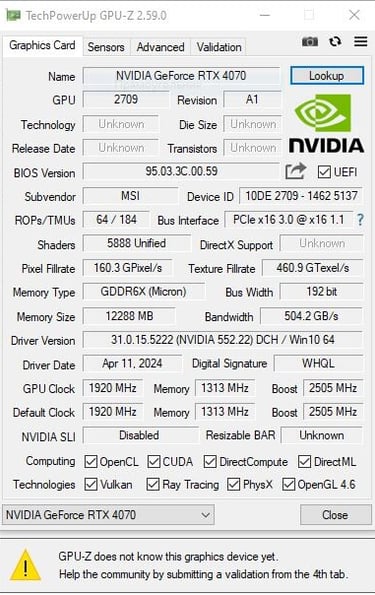 TechPowerUP a confirmé que ces nouvelles versions sont déjà sur le marché, et l'un de leurs lecteurs a contacté le site à propos de sa RTX 4070 Ventus 3X E de MSI. Il l'a testée sur GPU-Z, le logiciel qui permet aux utilisateurs de surveiller les performances et les spécifications de leur carte graphique .
