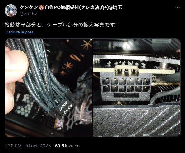 Dans cette affaire, ce n’est pas le connecteur 12V-2×6 qui est pointé du doigt, mais bien le câble lui-même. En regardant de plus près, certains internautes ont remarqué qu’un des pins n’était pas complètement inséré dans le connecteur, ce qui aurait pu provoquer un déséquilibre dans la distribution de puissance… et mener à une surchauffe.