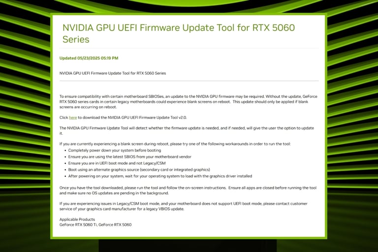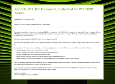 La société a maintenant publié l'outil de mise à jour 'NVIDIA GPU UEFI Firmware Update Tool for RTX 5060 Series', un nouveau VBIOS qui, selon NVIDIA, ne doit être appliqué seulement "si des écrans noirs se produisent".