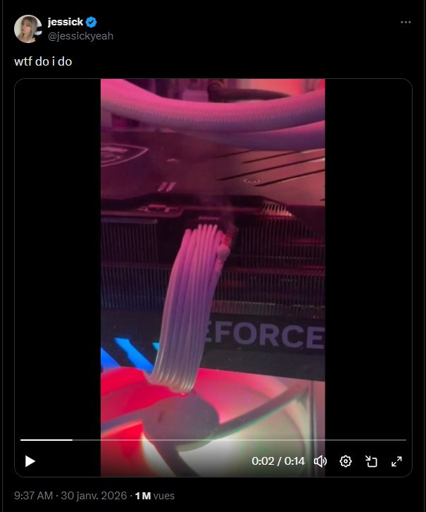 Une vidéo partagée sur X par la streameuse Jessick montre une carte graphique dégageant de la fumée à l’intérieur d’un PC en fonctionnement.