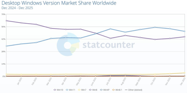 Entre octobre et décembre 2025, Windows 11 est passé de 55 % à un peu plus de 50 %, pendant que Windows 10 remontait de 41 % à 44 %. Même Windows 7 a légèrement progressé, frôlant les 4 %.
